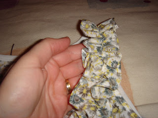 El volante es una tira de tela con medidas de 4 por 1'60 cm de largo con pequeño dobladillo y con frunce por el medio hasta llegar a la medida del escote.