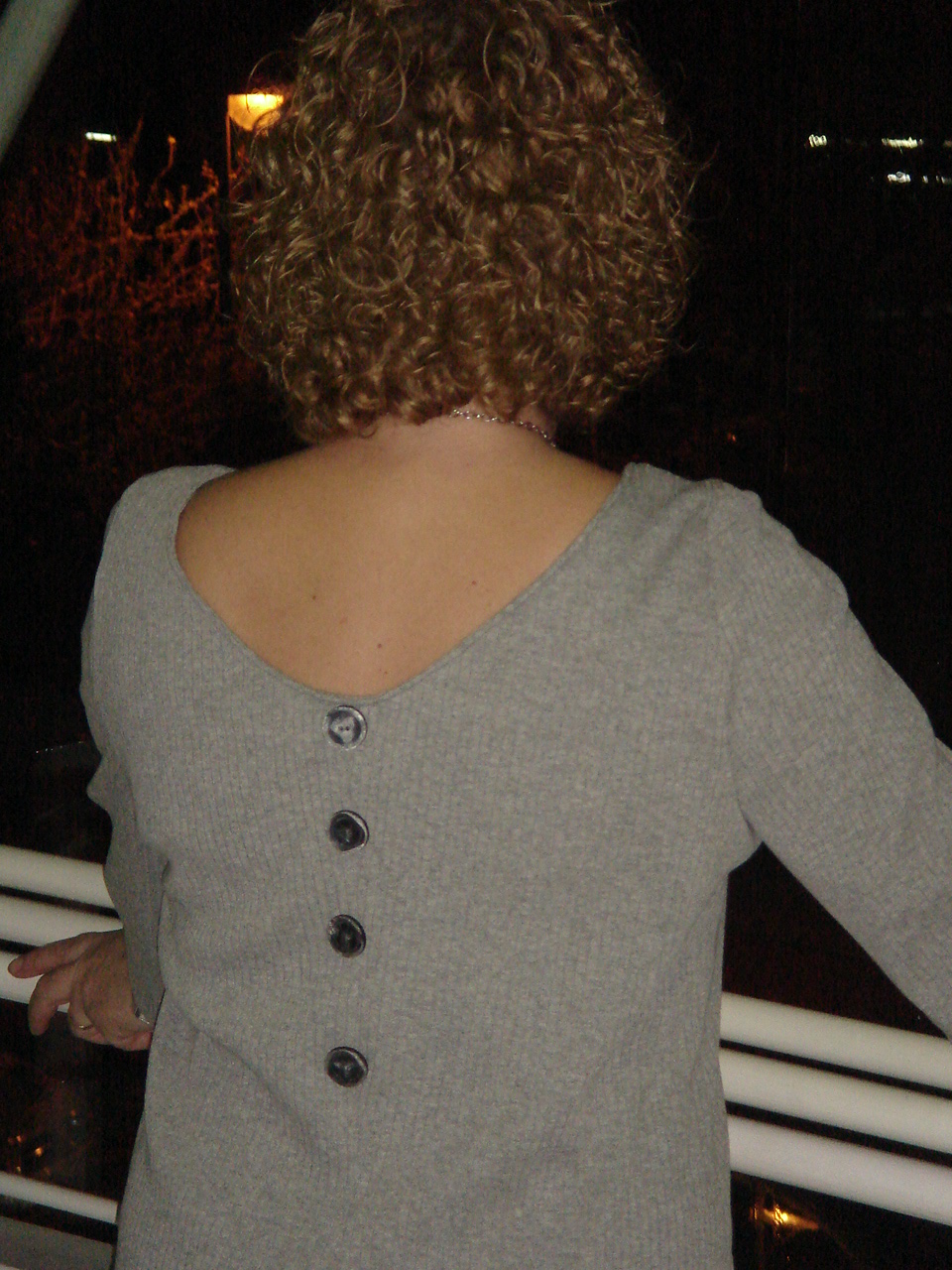 El cuello es refondo en la parte delantera y en escote de pico en la parte trasera, para rematar el cuello he utilizado la misma tela del vestido pero cortada al bies y como nota diferente una hilera de grandes botones en tonos grises decoran la espalda.