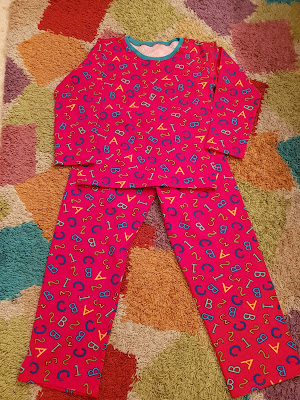 El tejido es de punto elastico , tipo camiseta , el fondo es de color rojo y lleva numeros y letras de diferentes colores , lo que hace que sea un pijama muyu alegre.